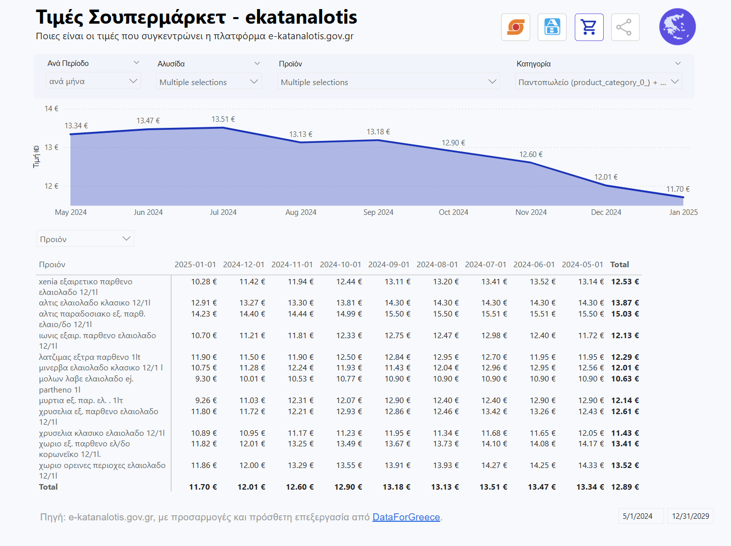 Το γράφημα που ακολουθεί απεικονίζει τη διακύμανση των τιμών του ελαιόλαδου στην ελληνική αγορά από τον Ιανουάριο του 2022 έως τον Ιανουάριο του 2025.